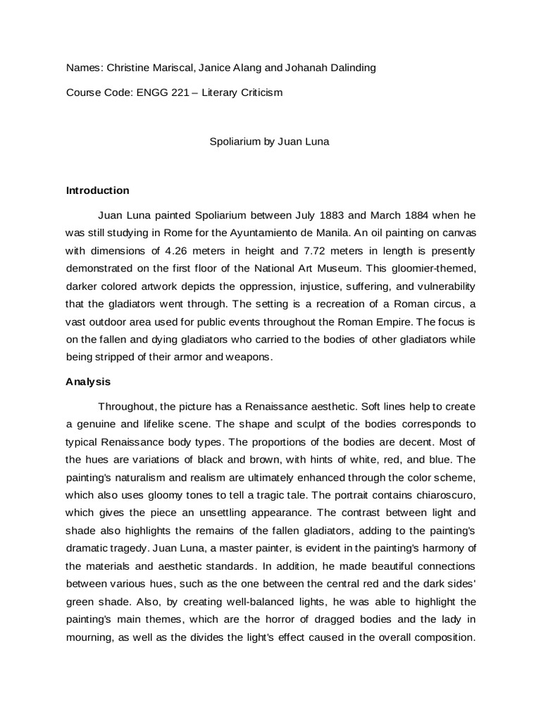 the present bear this out. Luna's Spoliarium's significance as a subject, brilliance as