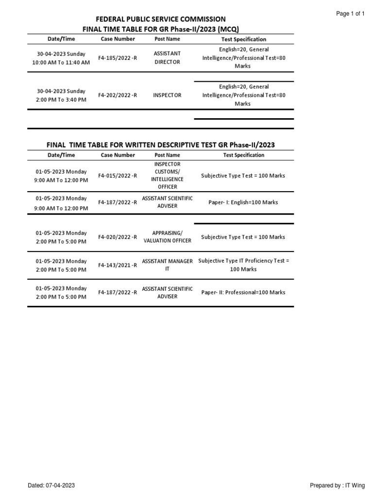 FINAL TIME TABLE FOR WRITTEN DESCRIPTIVE TEST GR Phase-II/2023