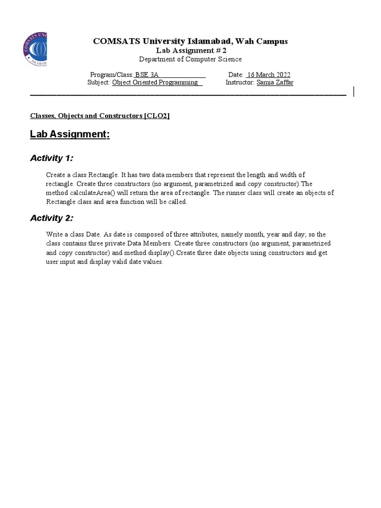 Subject: Object Oriented Programming Instructor: Samia Zaffar