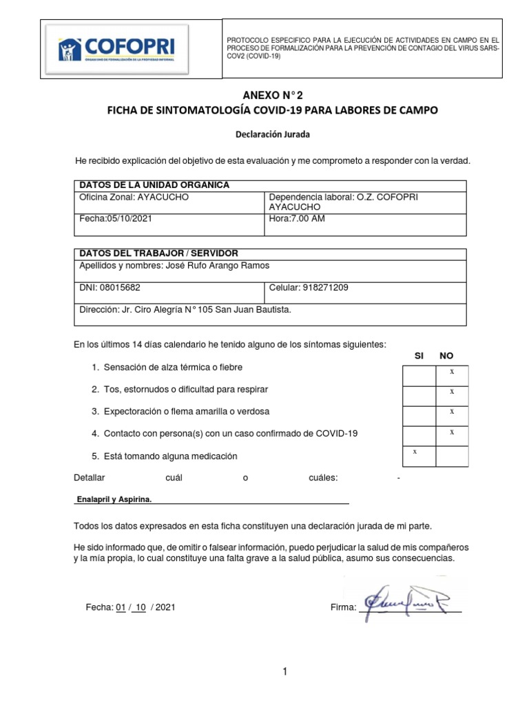FICHA DE SINTOMATOLOGÍA COVID-19 PARA LABORES DE CAMPO