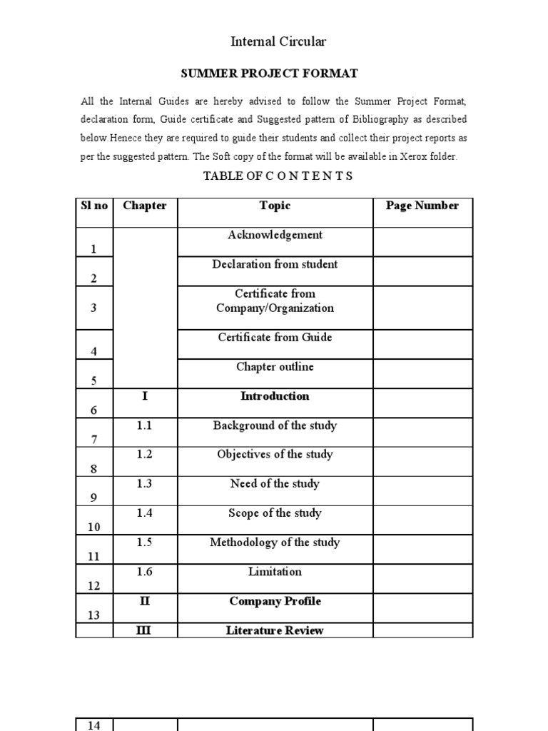 TABLE OF C O N T E N T S Sl no 1 Declaration from student 2 3 4 Chapter outline 5 I 6 1.1 7 1.2 8 1.3 9 1.4 10 1.5 11 1.6 12 II 13 III Literature Review Company Profile Limitation Methodology of the study Scope of the study Need of the study Objectives of the study Background of the study Introduction Certificate from Company/Organization Certificate from Guide Chapter Topic Acknowledgement Page Number