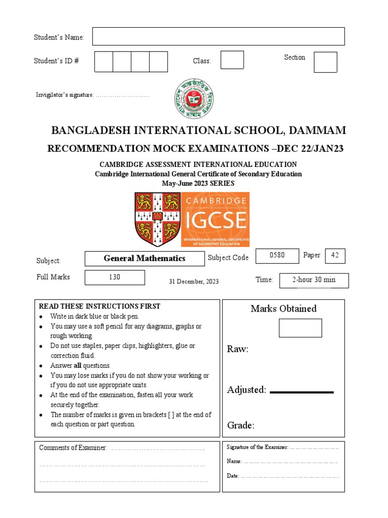 IGCSE Recommendation Mock Exam for May /June 2023 Series