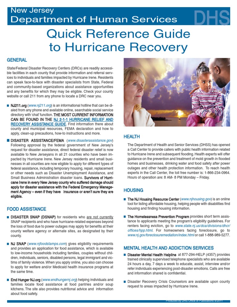 NJ211.org (www.nj211.org) is an informational hotline that can be dialed from any phone and available online, searchable social service directory with chat function. THE MOST CURRENT INFORMATION CAN BE FOUND IN THE NJ 2-1-1 HURRICANE RELIEF AND RECOVERY ASSISTANCE GUIDE. Find information there about county and municipal resources, FEMA declaration and how to apply, clean-up precautions, how-to instructions and more.