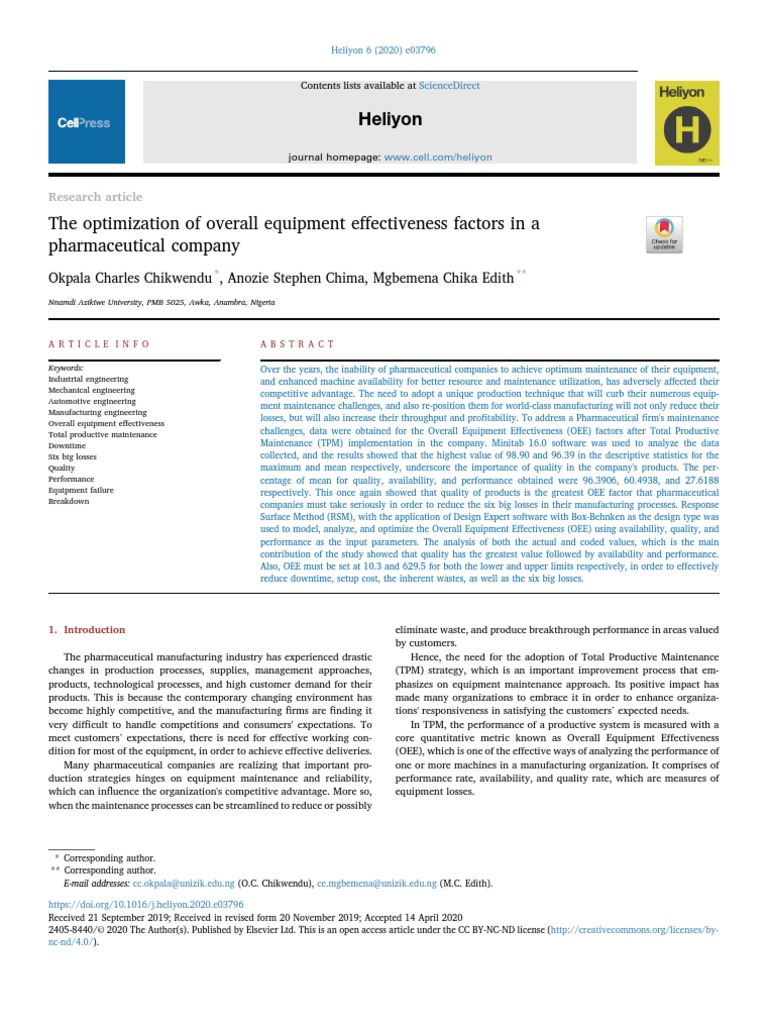 Heliyon: Okpala Charles Chikwendu, Anozie Stephen Chima, Mgbemena Chika Edith