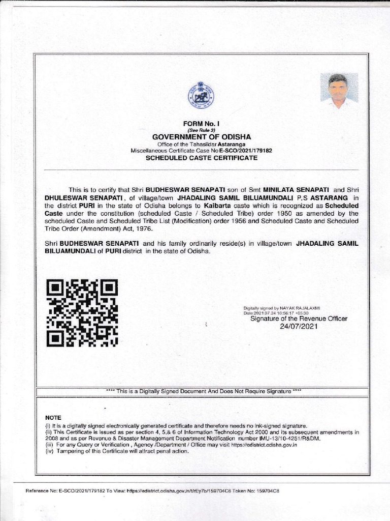 This is lo certify that shri BUDHESWAR SENAPATI son ol Smt MINILATA SENAPATI and Shri