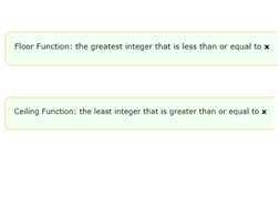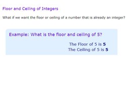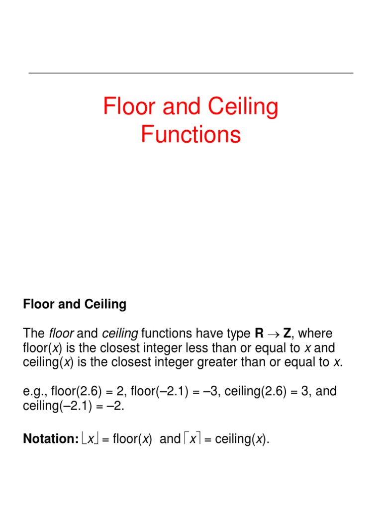 e.g., floor(2.6) = 2, floor(–2.1) = –3, ceiling(2.6) = 3, and