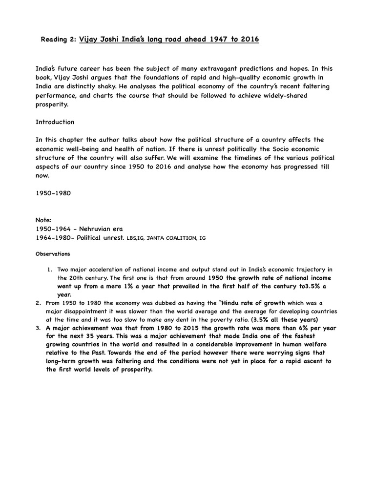 Reading 2: Vijay Joshi India’s long road ahead 1947 to 201