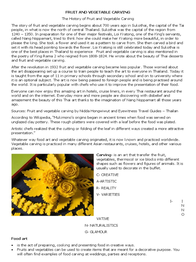 The story of fruit and vegetable carving begins about 700 years ago in Sukothai, the capital of the Tai