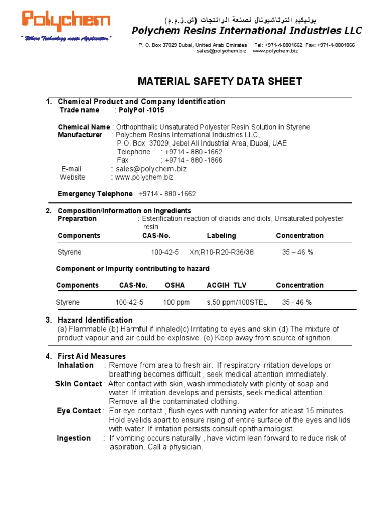 Chemical Name : Orthophthalic Unsaturated Polyester Resin Solution in Styrene