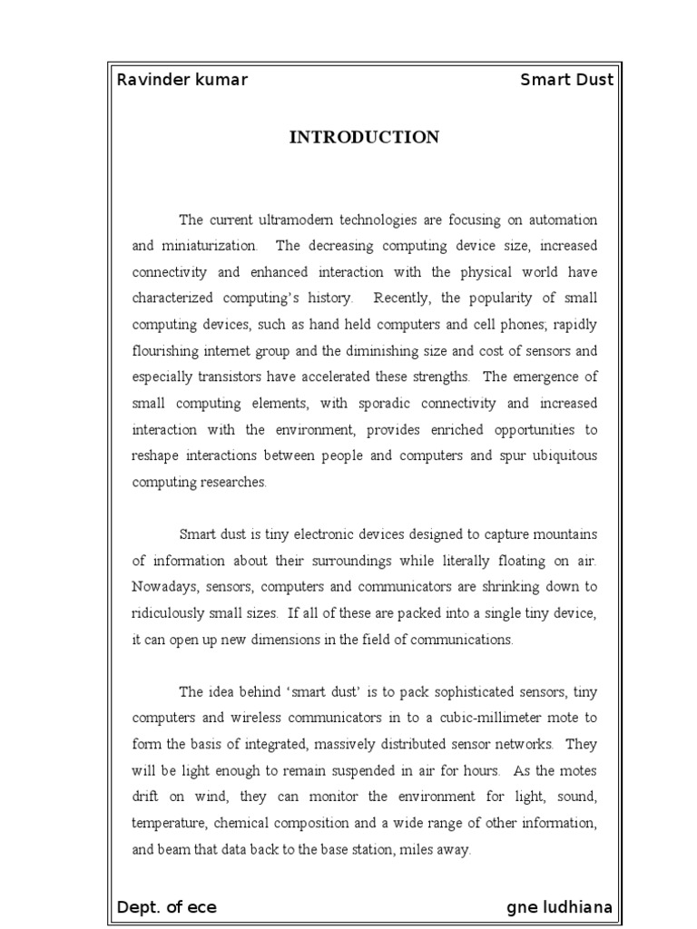 The current ultramodern technologies are focusing on automation and miniaturization. The decreasing computing device size, increased Recently, the popularity of small connectivity and enhanced interaction with the physical world have characterized computings history. computing devices, such as hand held computers and cell phones; rapidly flourishing internet group and the diminishing size and cost of sensors and especially transistors have accelerated these strengths. The emergence of small computing elements, with sporadic connectivity and increased interaction with the environment, provides enriched opportunities to reshape interactions between people and computers and spur ubiquitous computing researches. Smart dust is tiny electronic devices designed to capture mountains of information about their surroundings while literally floating on air. Nowadays, sensors, computers and communicators are shrinking down to ridiculously small sizes. If all of these are packed into a single tiny device, it can open up new dimensions in the field of communications. The idea behind smart dust is to pack sophisticated sensors, tiny computers and wireless communicators in to a cubic-millimeter mote to form the basis of integrated, massively distributed sensor networks. They will be light enough to remain suspended in air for hours. As the motes drift on wind, they can monitor the environment for light, sound, temperature, chemical composition and a wide range of other information, and beam that data back to the base station, miles away.