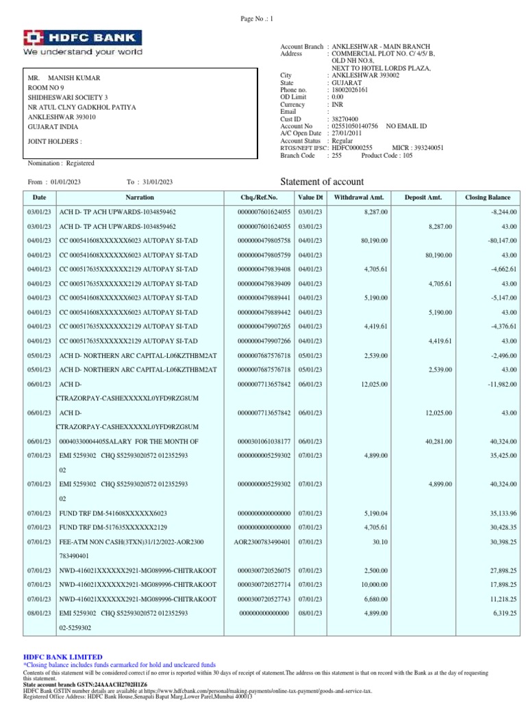 From : 01/01/2023 To : 31/01/2023 Statement of account