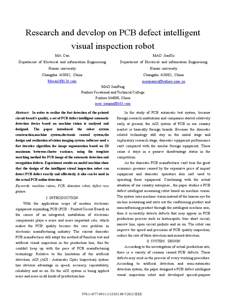 Keywords: machine vision; PCB; detection robot; defect reco situation of our country enterprise , the paper studies a PCB