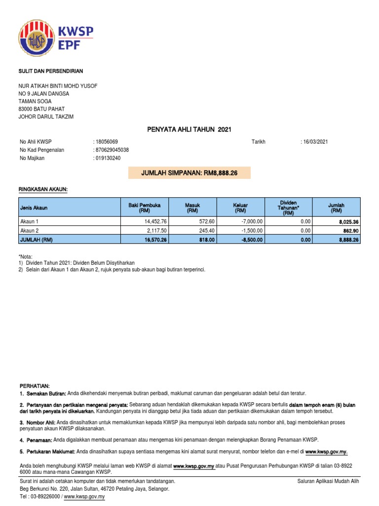 No Ahli KWSP : 18056069 Tarikh : 16/03/2021