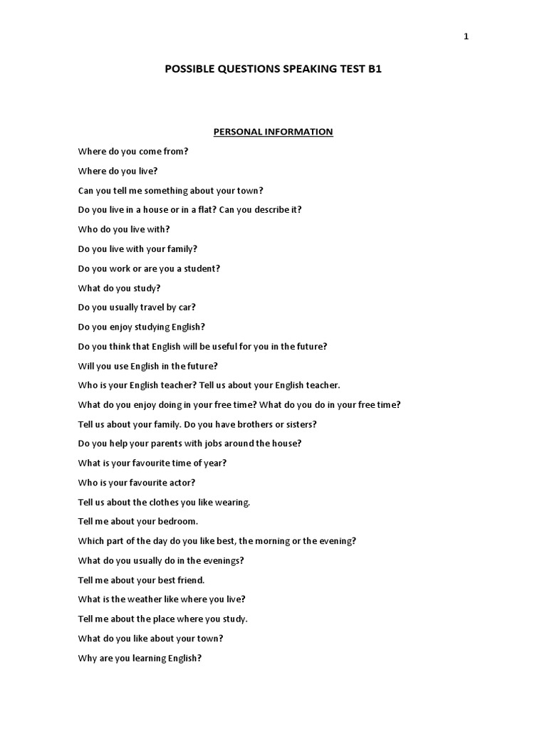 POSSIBLE QUESTIONS SPEAKING TEST B1