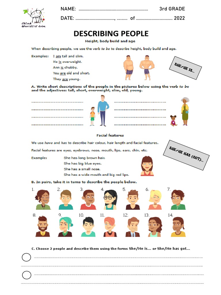 C. Choose 2 people and describe them using the forms She/He is... or She/He has got...