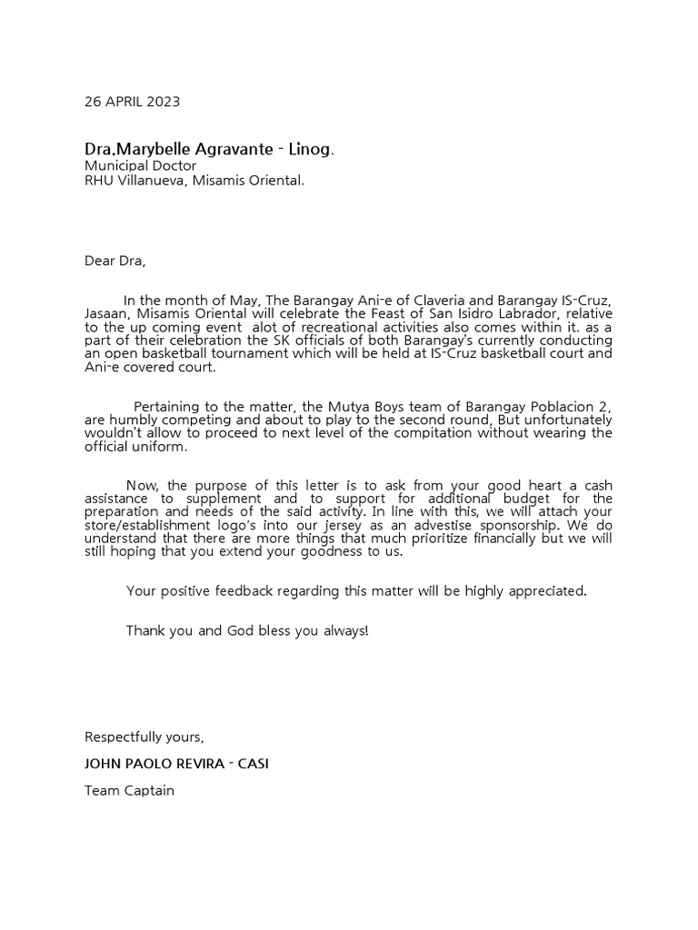Now, the purpose of this letter is to ask from your good heart a cash