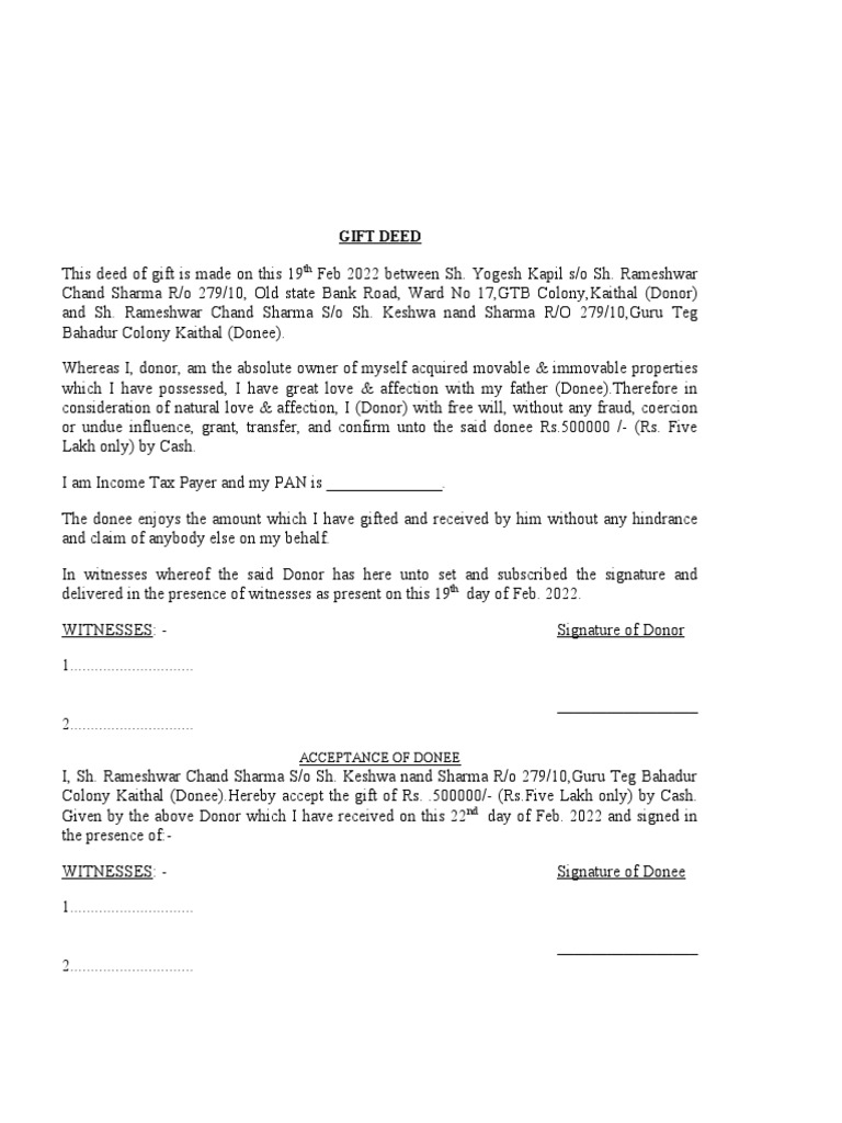 This deed of gift is made on this 19th Feb 2022 between Sh. Yogesh Kapil s/o Sh. Rameshwar