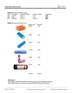 Pages 3 of 4 pages (©2016 by e-Gizmo Mechatronix Central “TP4056 1A LHION Battery ChargerSupporteds batteries type (-xe-Gizmo