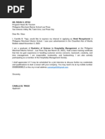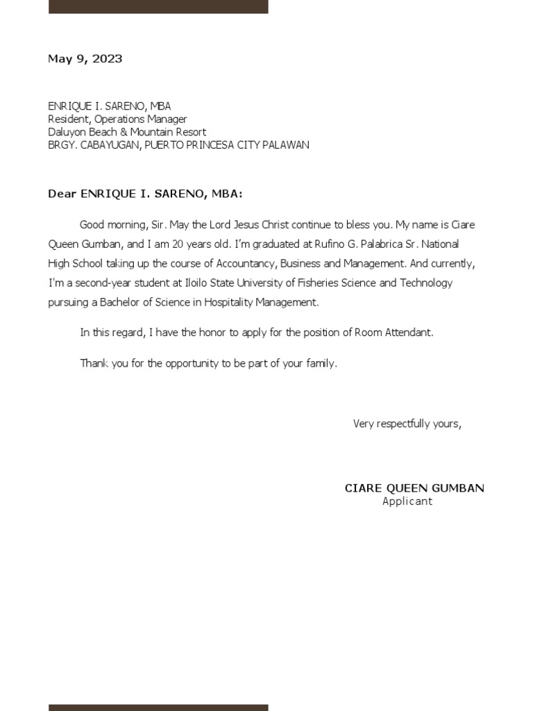 In this regard, I have the honor to apply for the position of Room Attendant.