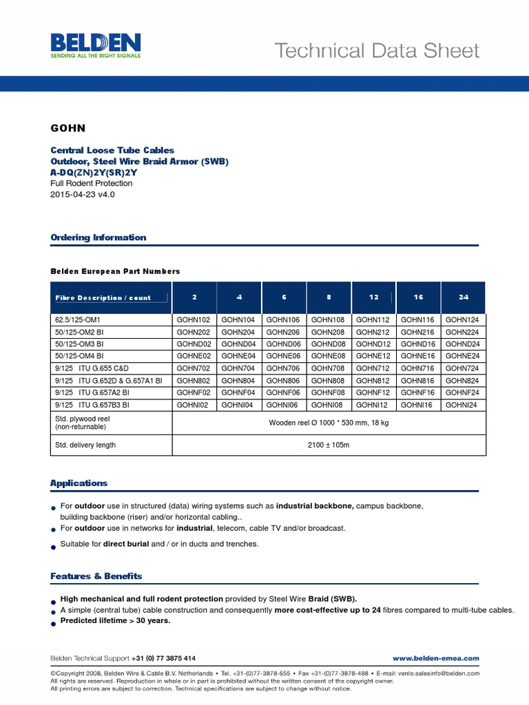 Identification: BELDEN OFC – “cable type” – number x type of fibre + date-, meter- and P/N marking.