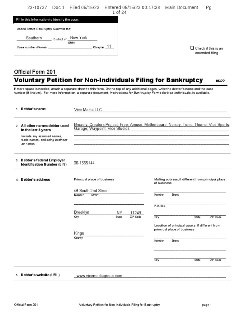 Vice Media, the edgy startup that promised to redefine news for Gen X and Millennials, filed for Chapter 11 bankruptcy protection early Monday with at least $548 million in debt after years …
