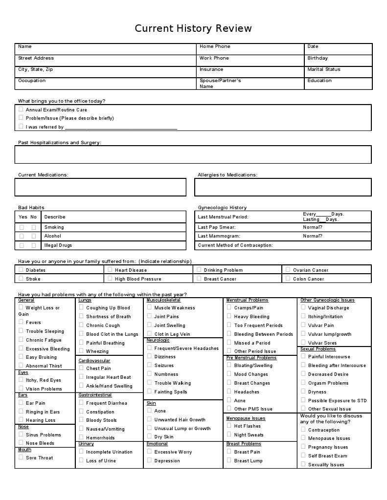 Gynecologic History Last Menstrual Period: Last Pap Smear: Last Mammogram: Current Method of Contraception: Every Days. Lasting Days. Normal? Normal?