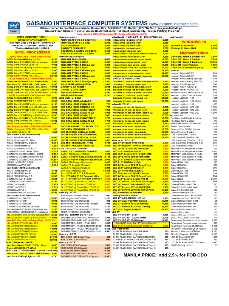 Intel Xeon X3430 (2.4ghz) s1156 9,795 SODIMM 16GB DDR5 4800 Kingston 3,995 MANILA PRICE: add 2.5% for FOB CDO
