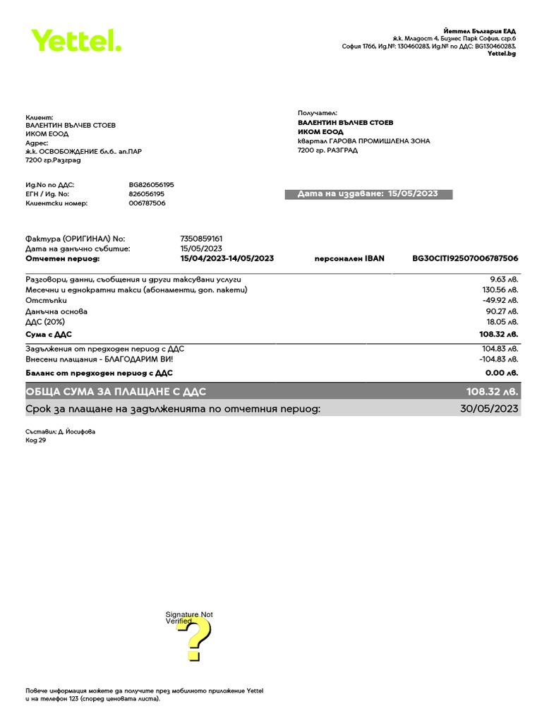 Отчетен период: 15/04/2023-14/05/2023 персонален IBAN BG30CITI92507006787506