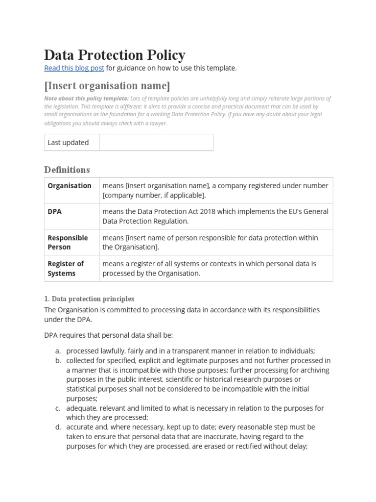 small organisations as the foundation for a working Data Protection Policy. If you have any doubt about your legal