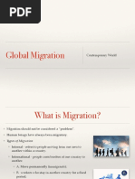 The main causes and factors driving contemporary global migration include disparities in income, employment opportunities, and social well-being between regions . Economic motives frequently drive migration, as individuals seek better employment or living conditions. Social factors such as family reunification also play a significant role . Additionally, push factors like political instability, conflict, and environmental disasters force people to migrate . Pull factors such as political stability, economic opportunities, and improved quality of life in destination countries attract migrants .