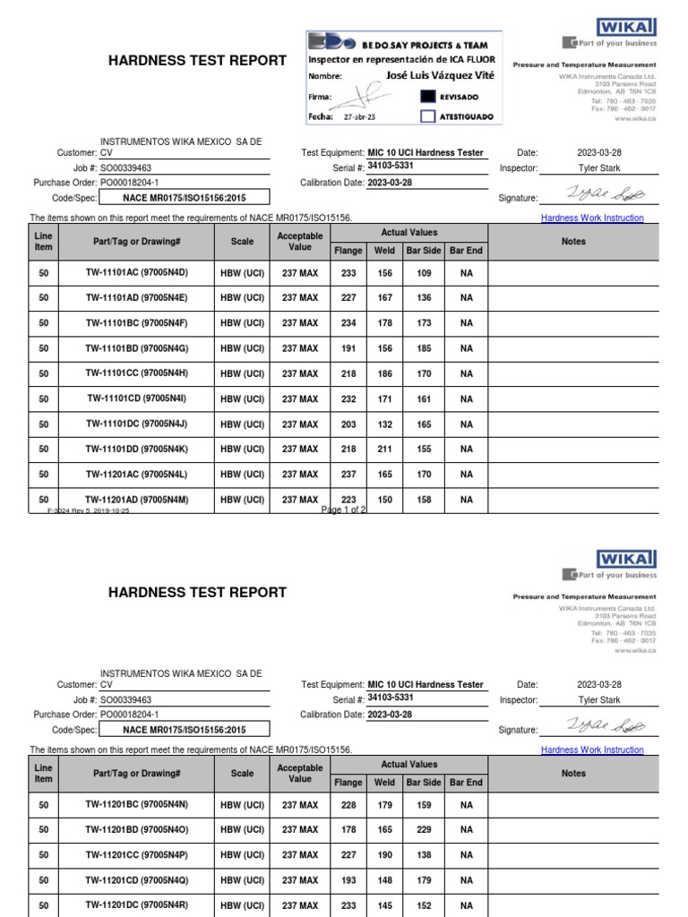 The items shown on this report meet the requirements of NACE MR0175/ISO15156. Hardness Work Instruction