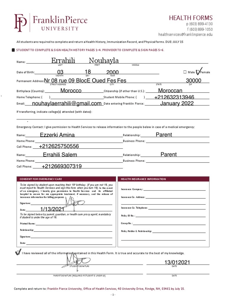 Complete and return to: Franklin Pierce University, Office of Health Services, 40 University Drive, Rindge, NH, 03461 by July 15.