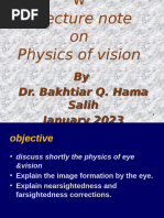 5.)Astigmatism This defect arises due to the develoment of different curvatures along different planes in the eye lens. A person suffering from astigmatism cannot see all the directions equally well, but a particular direction in the plane perpendicular to the lign of sight is most visible. There are many ways with which a person can detect this disease, many of which are 'do-it-yourself' technices. A person suffering from this disease wears glasses with different curvatures in different planes, which are known as cylindrical glasses.