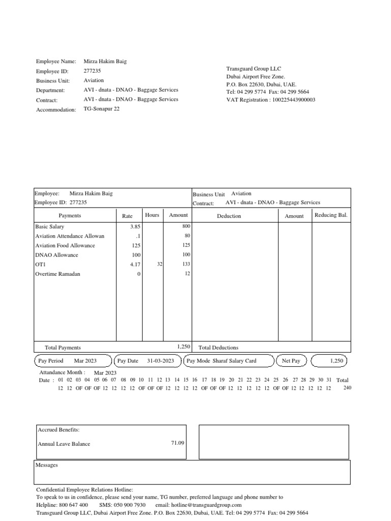 Pay Period Mar 2023 Pay Date 31-03-2023 Pay Mode Sharaf Salary Card Net Pay 1,250