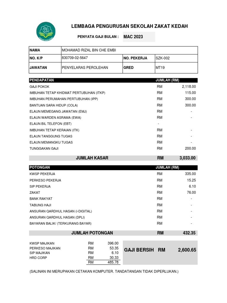 IMBUHAN TETAP KHIDMAT PERTUBUHAN (ITKP) RM 115.00