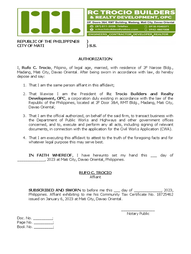 2. That likewise I am the President of Rc Trocio Builders and Realty
