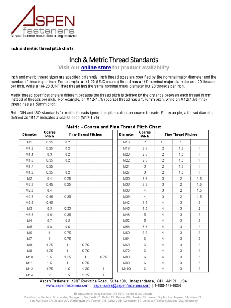 Metric - Coarse and Fine Thread Pitch Chart