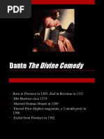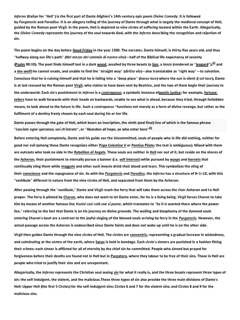 It is followed by Purgatorio and Paradiso. It is an allegory telling of the journey of Dante through what is largely the medieval concept of Hell, guided by the Roman poet Virgil. In the poem, Hell is depicted as nine circles of suffering located within the Earth. Allegorically, the Divine Comedy represents the journey of the soul towards God, with the Inferno describing the recognition and rejection of sin. The poem begins on the day before Good Friday in the year 1300. The narrator, Dante himself, is thirty-five years old, and thus "halfway along our life's path" (Nel mezzo del cammin di nostra vita)half of the Biblical life expectancy of seventy (Psalm 90:10). The poet finds himself lost in a dark wood, assailed by three beasts (a lion, a lonza (rendered as "leopard"), and a she-wolf) he cannot evade, and unable to find the "straight way" (diritta via)also translatable as "right way"to salvation. Conscious that he is ruining himself and that he is falling into a "deep place" (basso loco) where the sun is silent (l sol tace), Dante is at last rescued by the Roman poet Virgil, who claims to have been sent by Beatrice, and the two of them begin their journey to the underworld. Each sin's punishment in Inferno is a contrapasso, a symbolic instance ofpoetic justice; for example, fortunetellers have to walk forwards with their heads on backwards, unable to see what is ahead, because they tried, through forbidden means, to look ahead to the future in life. Such a contrapasso "functions not merely as a form of divine revenge, but rather as the fulfilment of a destiny freely chosen by each soul during his or her life. Dante passes through the gate of Hell, which bears an inscription, the ninth (and final) line of which is the famous phrase "Lasciate ogne speranza, voi ch'intrate", or "Abandon all hope, ye who enter here"