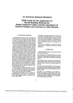 Introduction and Scope: Introduces the purpose and objectives of the standard, providing an overview of the guidelines for sheath-bonding methods. References: Lists the documents and standards referenced throughout the guide, offering context and substantiation. Recent Developments: Discusses advancements related to sheath-bonding and voltage calculations, reflecting technological progress. Guidelines Summary: Summarizes the key guidelines, highlighting the essential safety protocols and practices for effective application. Bonding Methods: Describes different methods used for bonding cable sheaths, discussing both traditional and modern techniques. Grounding: Presents grounding procedures and techniques linked to sheath-bonding, ensuring electrical safety. Bibliography: A list of works cited in the document providing a foundation for further research and cross-reference. Effects on Parallel Telephone and Signal Cables: Analyzes the impacts of sheath-bonding on nearby telephone and signal cables, proposing mitigation strategies. Appendices: Includes additional detailed discussions, calculations, and specific analyses supplementary to the main text. IEEE Guide for the Application of