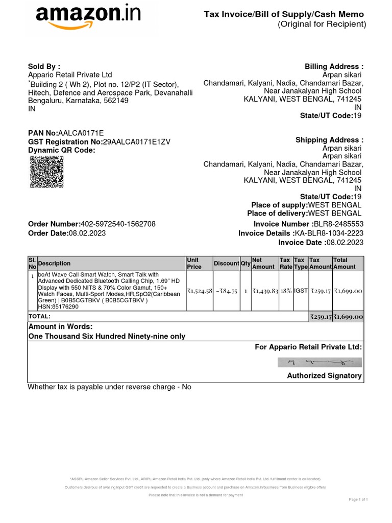 Order Number:402-5972540-1562708 Invoice Number :BLR8-2485553