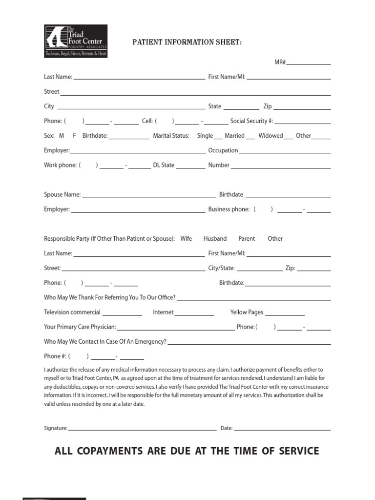 I authorize the release of any medical information necessary to process any claim. I authorize payment of benefits either to myself or to Triad Foot Center, PA as agreed upon at the time of treatment for services rendered. I understand I am liable for any deductibles, copays or non-covered services. I also verify I have provided The Triad Foot Center with my correct insurance information. If it is incorrect, I will be responsible for the full monetary amount of all my services. This authorization shall be valid unless rescinded by one at a later date.