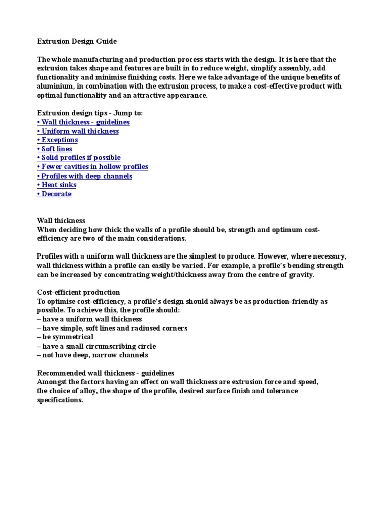 It is here that the extrusion takes shape and features are built in to reduce weight, simplify assembly, add functionality and minimise finishing costs. Here we take advantage of the unique benefits of aluminium, in combination with the extrusion process, to make a cost-effective product with optimal functionality and an attractive appearance. Extrusion design tips - Jump to: Wall thickness - guidelines Uniform wall thickness Exceptions Soft lines Solid profiles if possible Fewer cavities in hollow profiles Profiles with deep channels Heat sinks Decorate Wall thickness When deciding how thick the walls of a profile should be, strength and optimum costefficiency are two of the main considerations. Profiles with a uniform wall thickness are the simplest to produce. However, where necessary, wall thickness within a profile can easily be varied. For example, a profiles bending strength can be increased by concentrating weight/thickness away from the centre of gravity. Cost-efficient production To optimise cost-efficiency, a profiles design should always be as production-friendly as possible. To achieve this, the profile should: have a uniform wall thickness have simple, soft lines and radiused corners be symmetrical have a small circumscribing circle not have deep, narrow channels Recommended wall thickness - guidelines Amongst the factors having an effect on wall thickness are extrusion force and speed, the choice of alloy, the shape of the profile, desired surface finish and tolerance specifications.