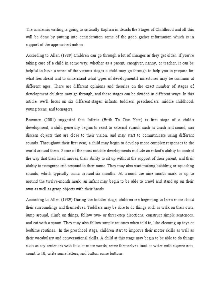 The academic writing is going to critically Explain in details the Stages of Childhood and all this