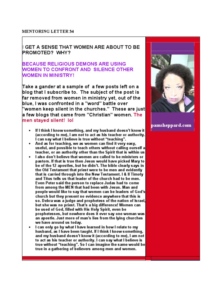 I GET A SENSE THAT WOMEN ARE ABOUT TO BE PROMOTED? WHY? BECAUSE RELIGIOUS DEMONS ARE USING WOMEN TO CONFRONT AND SILENCE OTHER WOMEN IN MINISTRY! Take a gander at a sample of a few posts left on a blog that I subscribe to. The subject of the post is far removed from women in ministry yet, out of the blue, I was confronted in a "word" battle over "women keep silent in the churches." These are just a few blogs that came from "Christian" women. The men stayed silent! lol