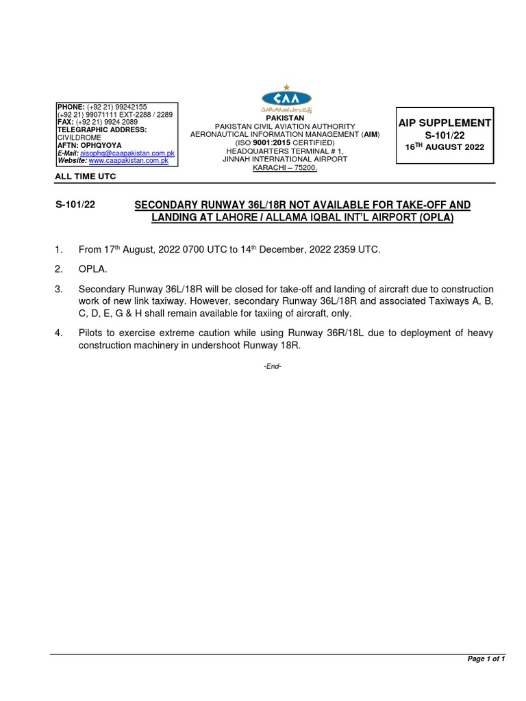 PAKISTAN CIVIL AVIATION AUTHORITY AIP SUPPLEMENT