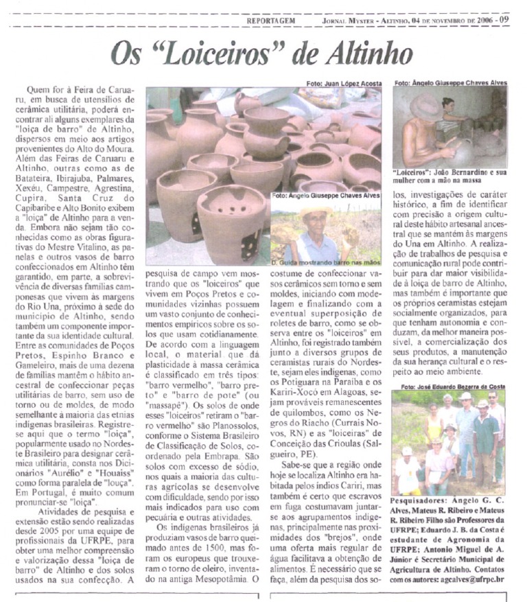 Quem for a Feira de Caruaru, em busca de utenslios de cera mica utilitria, poder encontrar ali alguns exemplares da "Ioic;:a de barro" de Altinho, dispersos em meio aos artigos provenientes do Alto do Moura. Alm das Feiras de Caruaru e Altinho, outras como as de Batateira, Ibirajuba, Palmares, Xexu, Campestre, Agrestina, Cupira, Santa Cruz do Capibaribe e Alto Bonito exibem a "Ioic;:a" de Altinho para a venda. Embora nao sejam tao conhecidas como as obras figurativas do Mestre Yitalino, as panelas e outros vasos de barro confeccionados em Altinho tem garantido, em parte, a sobrevivencia de diversas familias camponesas que vivem as margens do Rio Una, prximo a sede do l11unicpio de Altinho, sendo tambl11um componente importante da sua identidade cultural. Entre as comunidades de Poc;:os Pretos, Espinho Branco e Gameleiro, mais de uma dezena de familias mantem o hbito ancestral de confeccionar pec;:as utilitrias de barro, sem uso de torno ou de moldes, de modo semelhante a maioria das etnias indigenas brasileiras. Registrese aqui que o termo "Ioic;:a", popularmente usado no Nordeste Brasileiro para designar ceramica utilitria, consta nos Dicionrios "Aurlio" e "Houaiss" como forma paralela de "Iouc;:a". Em Portugal, muito comum pronunciar-se "Ioic;:a". Atividades de pesquisa e extensao estao sendo realizadas desde 2005 por uma equipe de profissionais da UFRPE, para obter uma melhor compreensao e valorizac;:ao dessa "Ioic;:a de barro" de Altinho e dos solos usados na sua confecc;:ao. A pesquisa de campo vem mostrando que os "Ioiceiros" que vivem em Poc;:os Pretos e comunidades vizinhas possuem um vasto conjunto de conhecimentos empricos sobre os solos que usam cotidianamente. De acordo com a linguagem local, o material que d plasticidade a massa cera mica classificado em tres tipos: "barro vermelho", "barro preto" e "barro de pote" (ou "massape"). Os solos de onde esses "Ioiceiros" retiram o "barro vermelho" sao Planossolos, conforme o Sistema Brasileiro de Classificac;:ao de Solos, coordenado pela Embrapa. Sao solos com excesso de sdio, nos quais a maioria das culturas agrcolas se desenvolve com dificuldade, sendo por isso mais indicados para uso com pecuria e outras atividades. Os indgenas brasileiros j produziam vasos de barro queimado antes de 1500, mas foram os europeus que trouxeram o torno de oleiro, inventado na antiga Mesopotamia. O