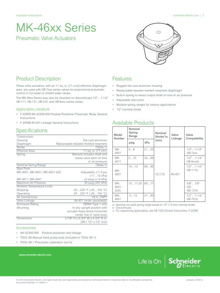 Enclosure Rating NEMA Type 1 only a - Nominal (no load) spring range based on 1/2” (13 mm) nominal stroke.