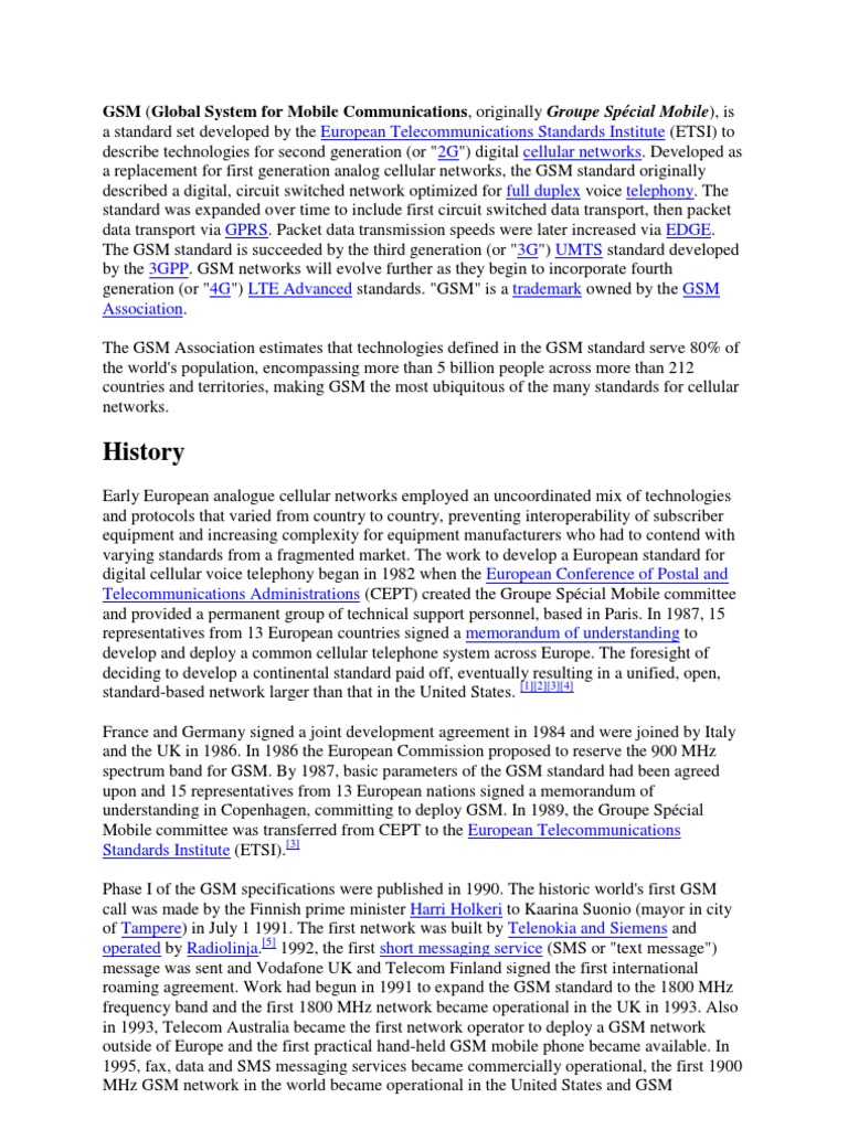 GSM (Global System for Mobile Communications, originally Groupe Spcial Mobile), is a standard set developed by the European
