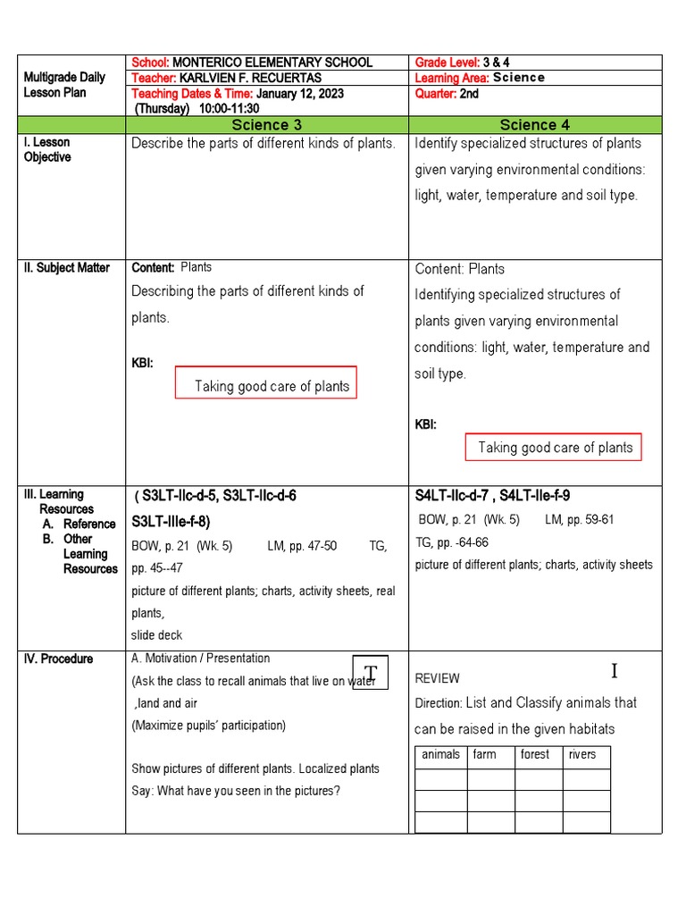 Multigrade Daily Teacher: KARLVIEN F. RECUERTAS Learning Area: Science