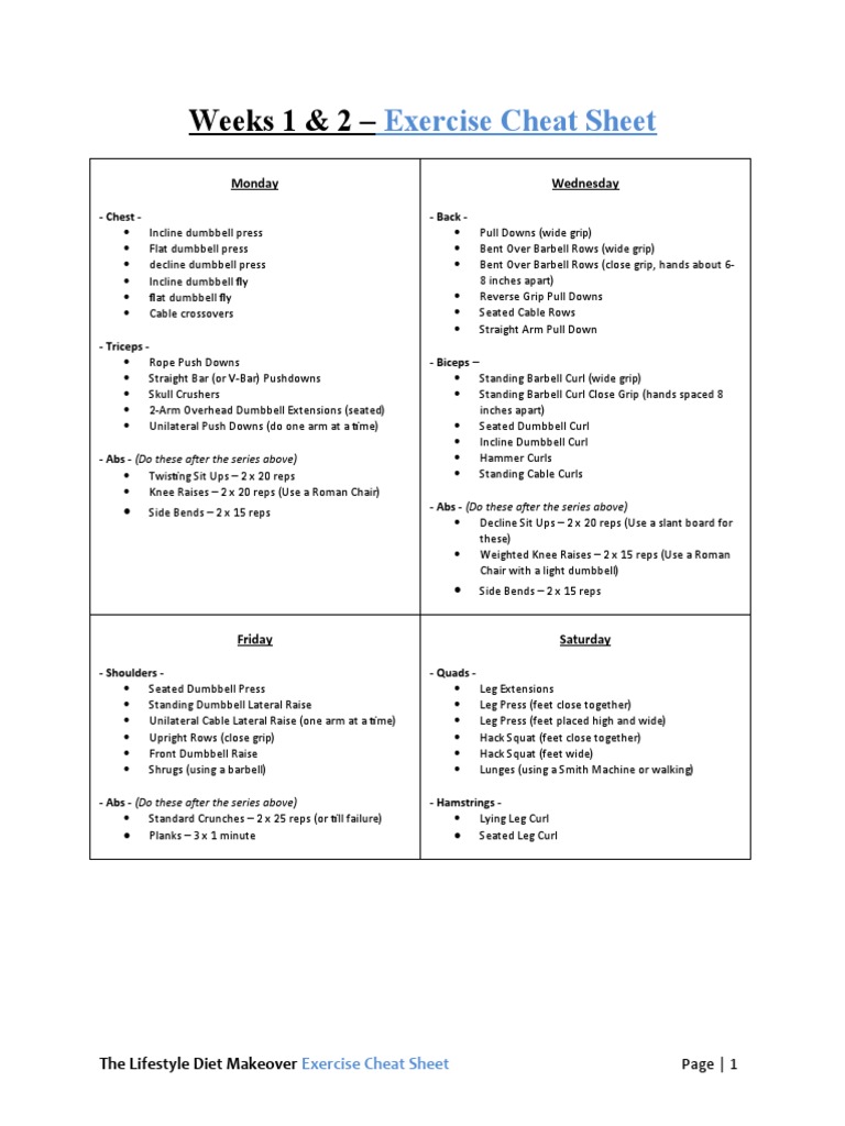 Weeks 1 & 2 – Exercise Cheat Sheet